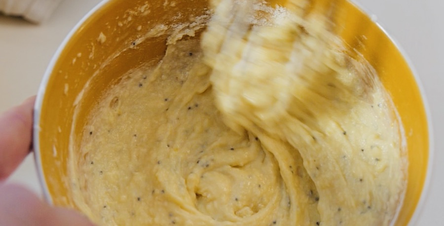 - Gradually add the dry ingredients (flour, baking powder, poppy seeds) to the wet mixture. Mix just until the batter is smooth, don’t overmix!